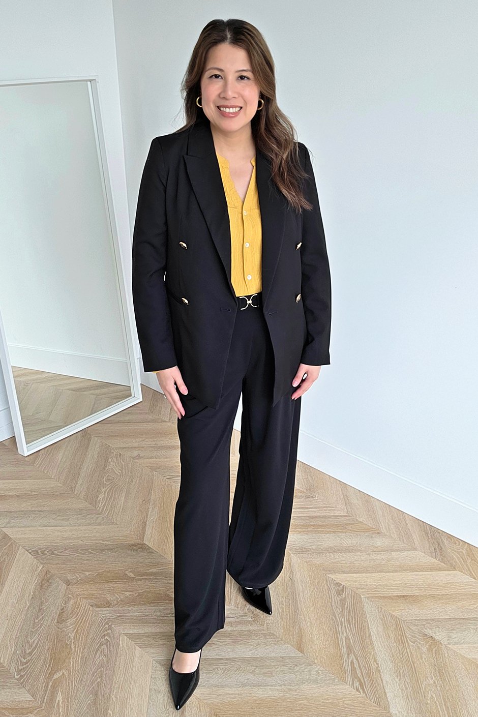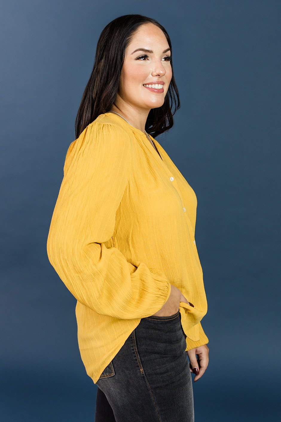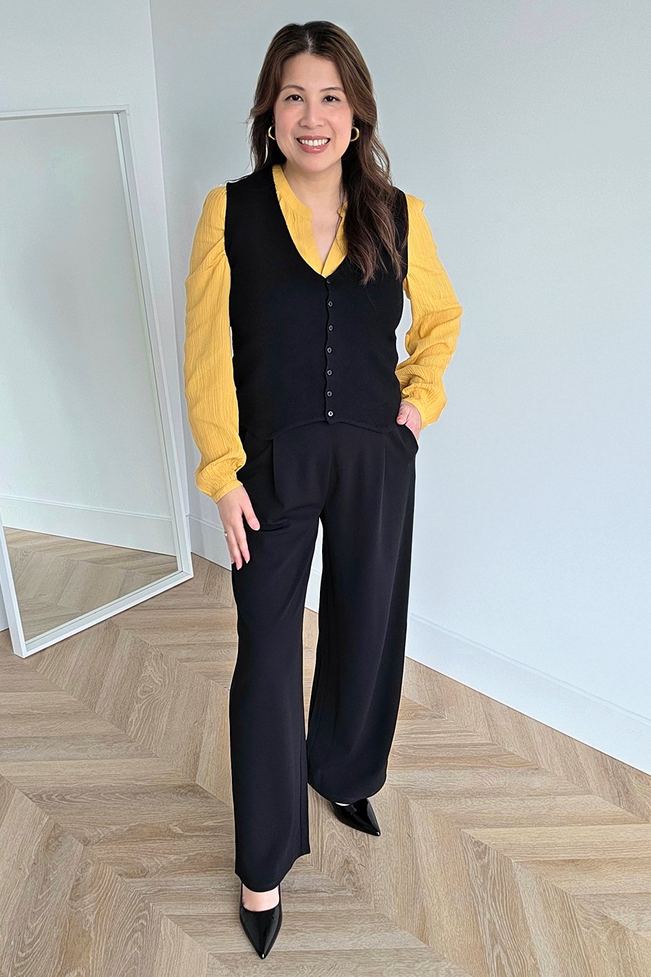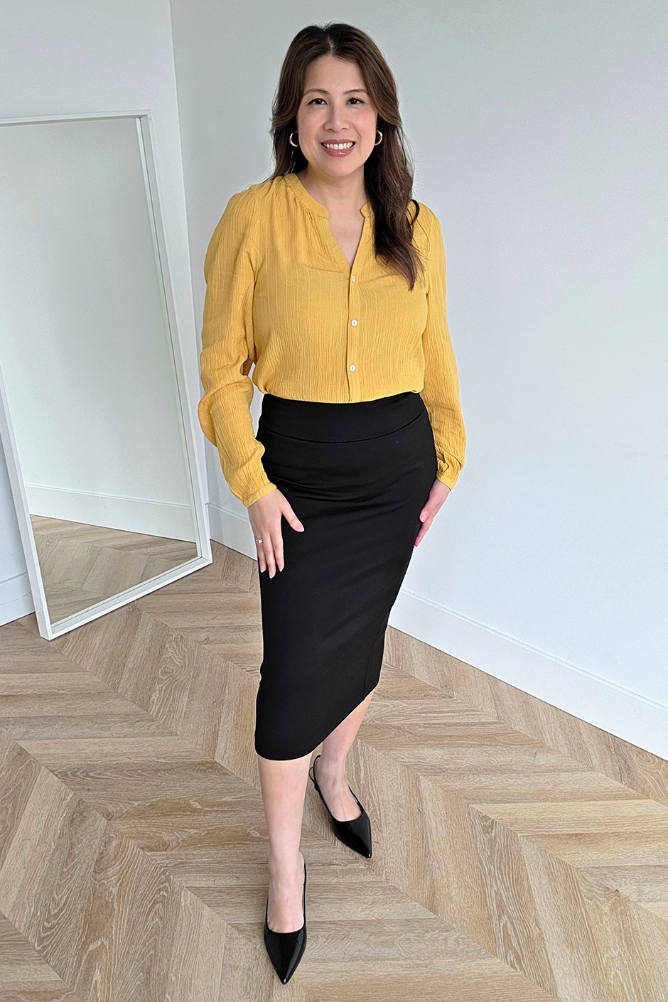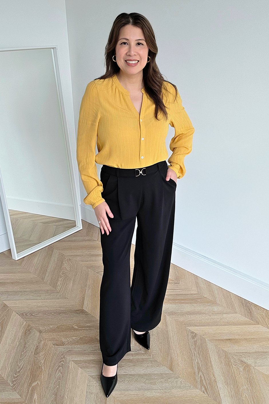 I love tops that instantly look put together. This top is a lightweight crepe and the style is just so flattering. There is a banded collar that goes into a V-neck and functional buttons. Perfect to frame your face and add some jewelry. The sleeves are nice and loose, and they form a gentle balloon at your cuffs. Very easy to tuck in and layer with other pieces. Wear it alone or as a base for your blazer, vest or cardigan. I am usually size Small in tops and size 36/38 in Euro-sized tops. I am wearing size 36 here, and it fits comfortably. If you need more room in the bust, I suggest sizing up or layering with a cami/tank and unbuttoning a few buttons.