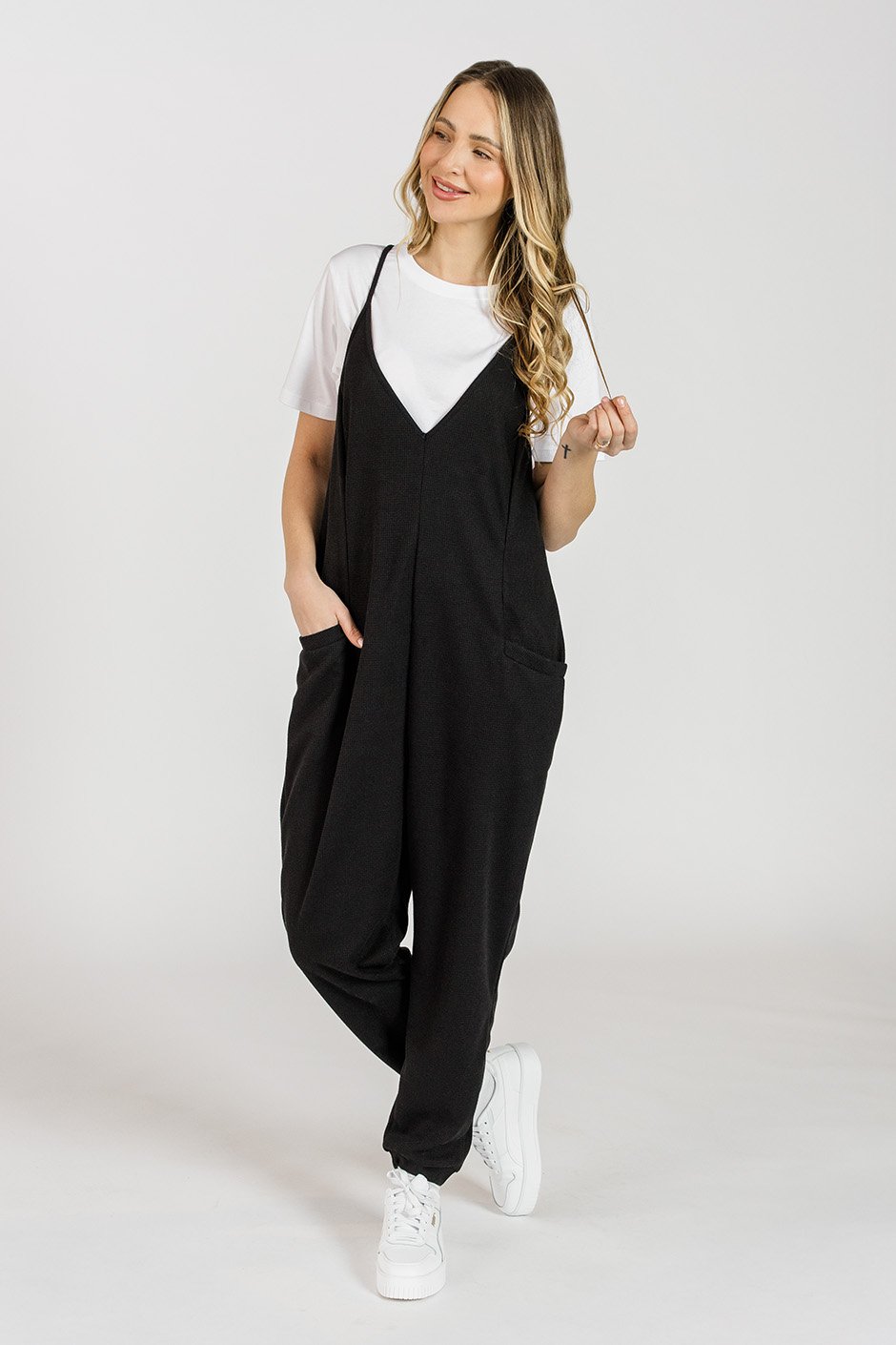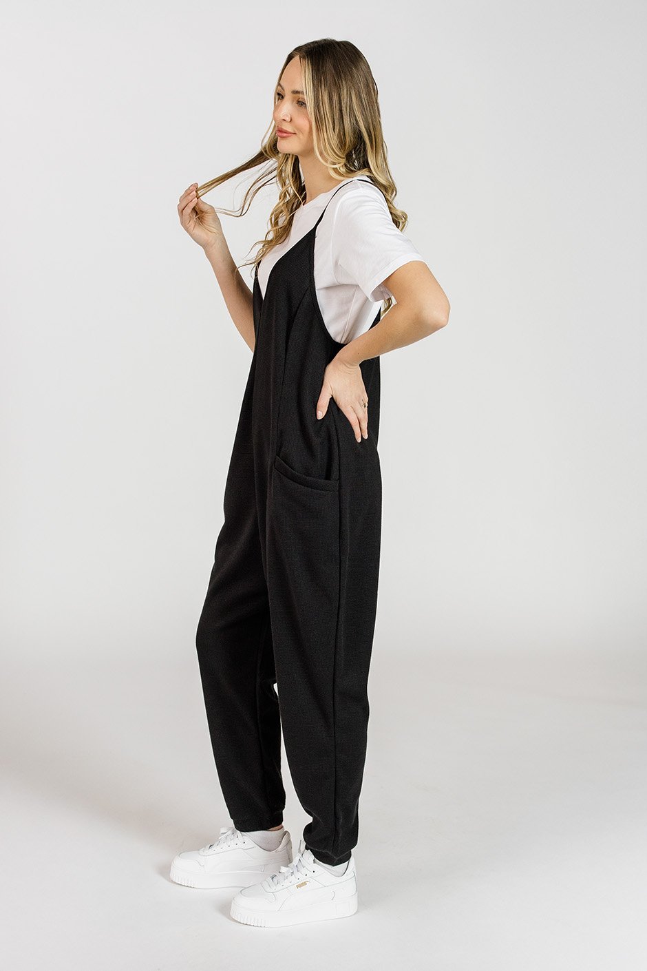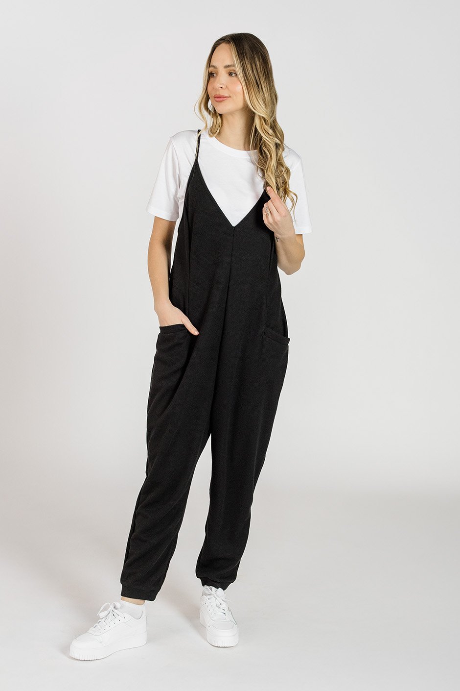 The Feeling Free Jumpsuit is a lightweight, stretchy dream with a soft waffle texture that moves with you. Adjustable straps let you find your perfect fit, while jogger-style cuffs add a relaxed touch. Finished with two front pockets for that extra bit of practicality!