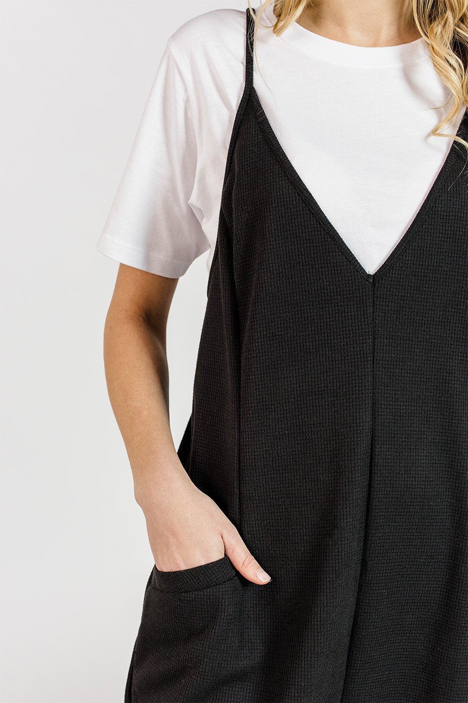 If you were a fan of our In the Mood Jumpsuit you're going to LOVE this new Jumpsuit by Salti Road!!! It feels like the same adorable cut as the In the Mood Jumpsuit but with some exciting differences. This one is a beautiful WAFFLE material. It's so soft and stretchy. It has a very relaxed fit and giant POCKETS!!!! It also features adjustable shoulder straps which is a big thing for me because I have smaller shoulders. I'm wearing the size small and it fits with lots of room. If your size down is available, you could go down one if you wanted a less relaxed fit but I love the comfiness of my true size on me! It’s coming in few colours as well and the price point is incredible on this!! A huge win all over! I'm so excited for this piece! You're going to love it!!