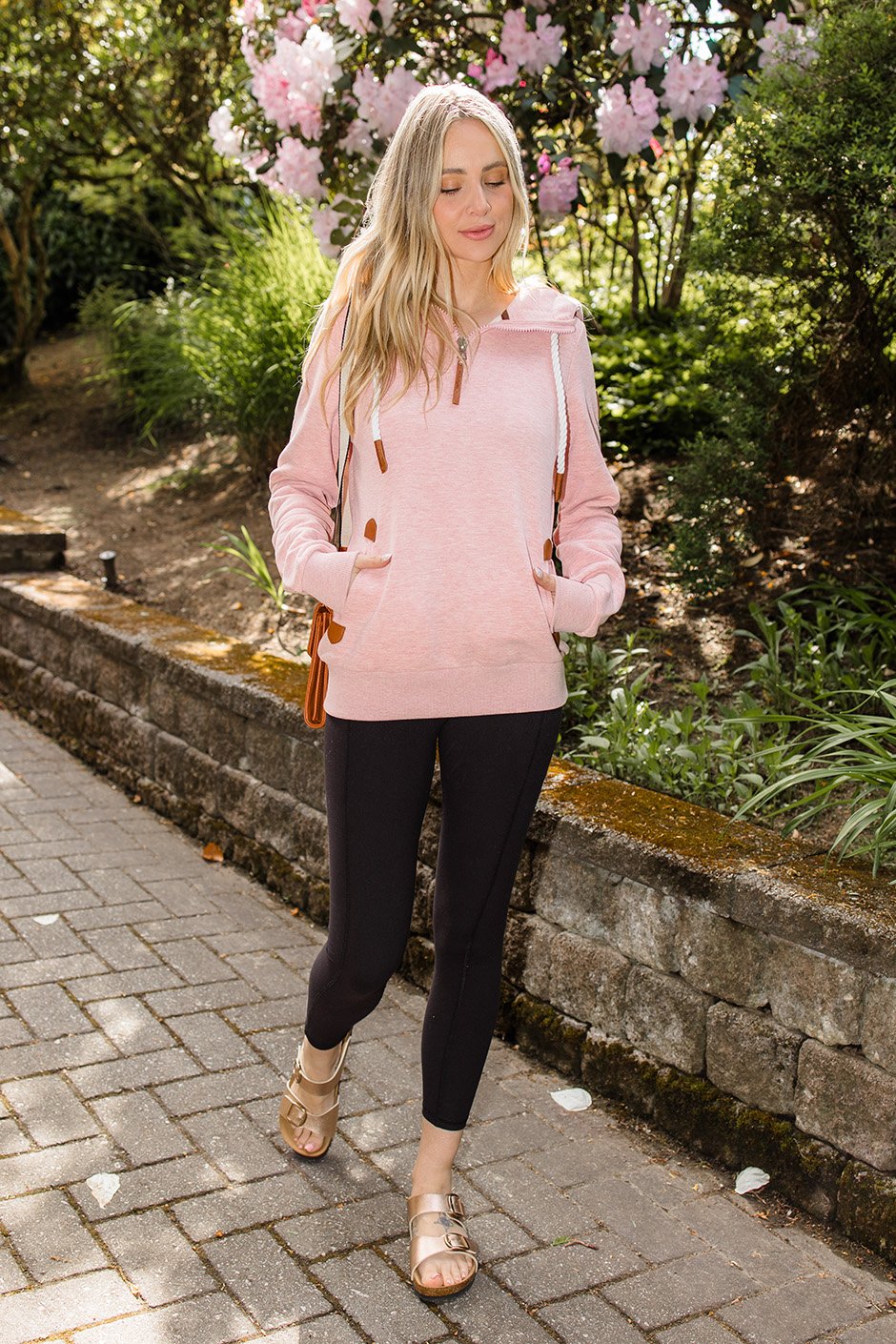 Yay for new Wanakome! This sweater has the perfect comfortable, snug fit with ribbed cuffs and hem. The two roomy front pockets offer extra space, and the standard pull tabs are a nice touch. I’m wearing a size small, and I absolutely love the fit!