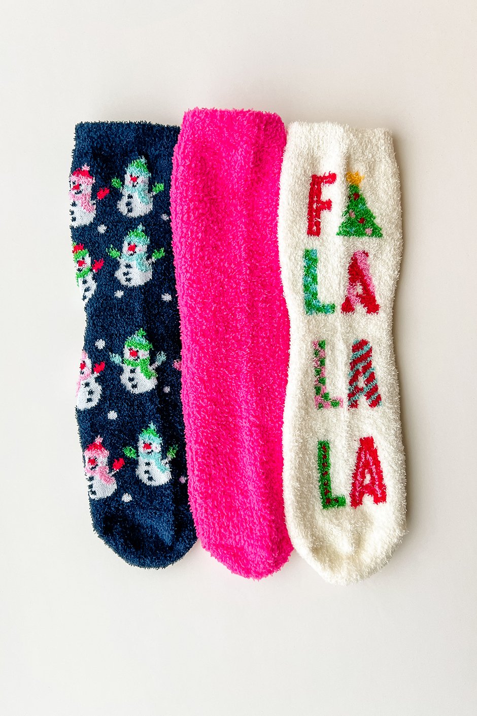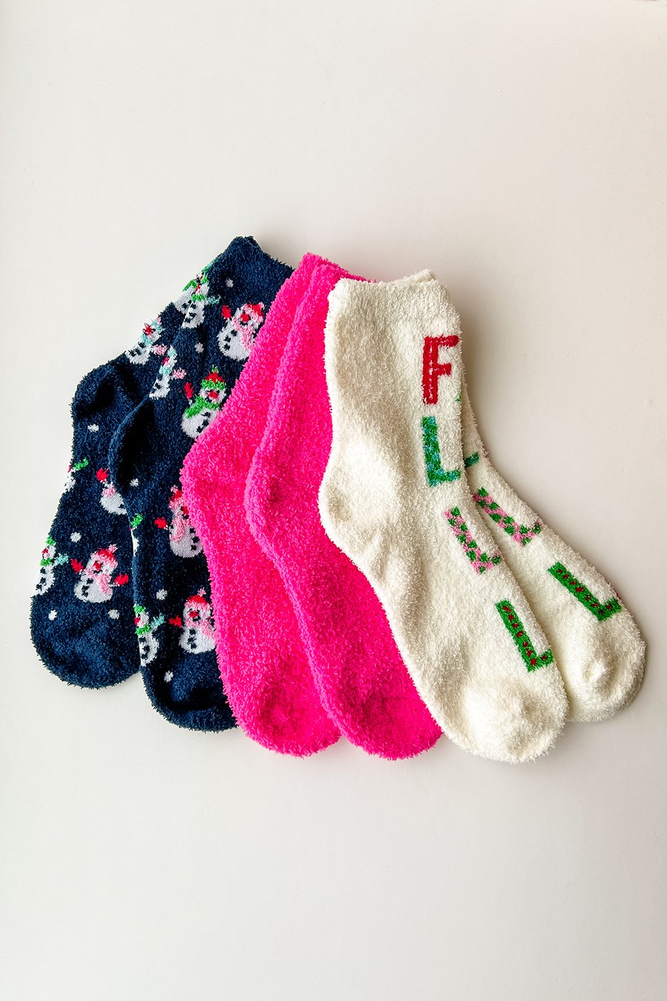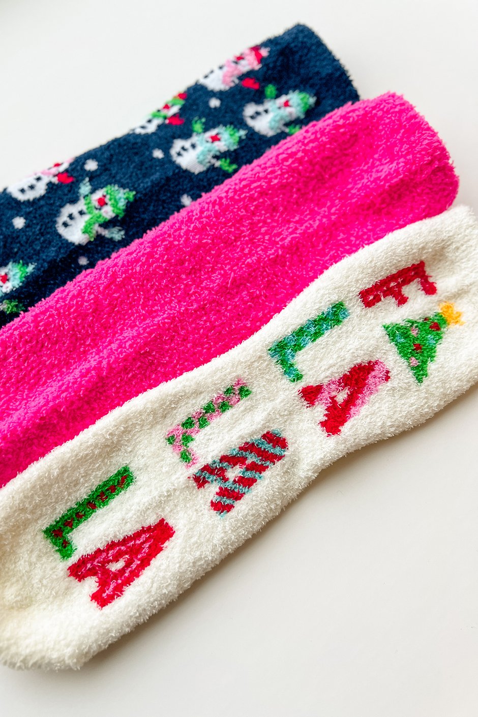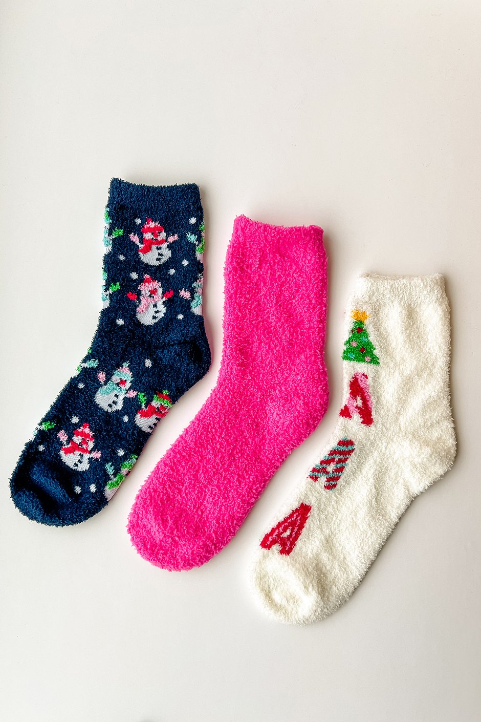 The perfect holiday socks are here! A 3-pack of holiday socks mean you can wear 3 different styles depending on your mood. They are all super fuzzy, soft socks- perfect for a cozy Christmas! These make for a great gift, stocking stuffer or treat yourself!