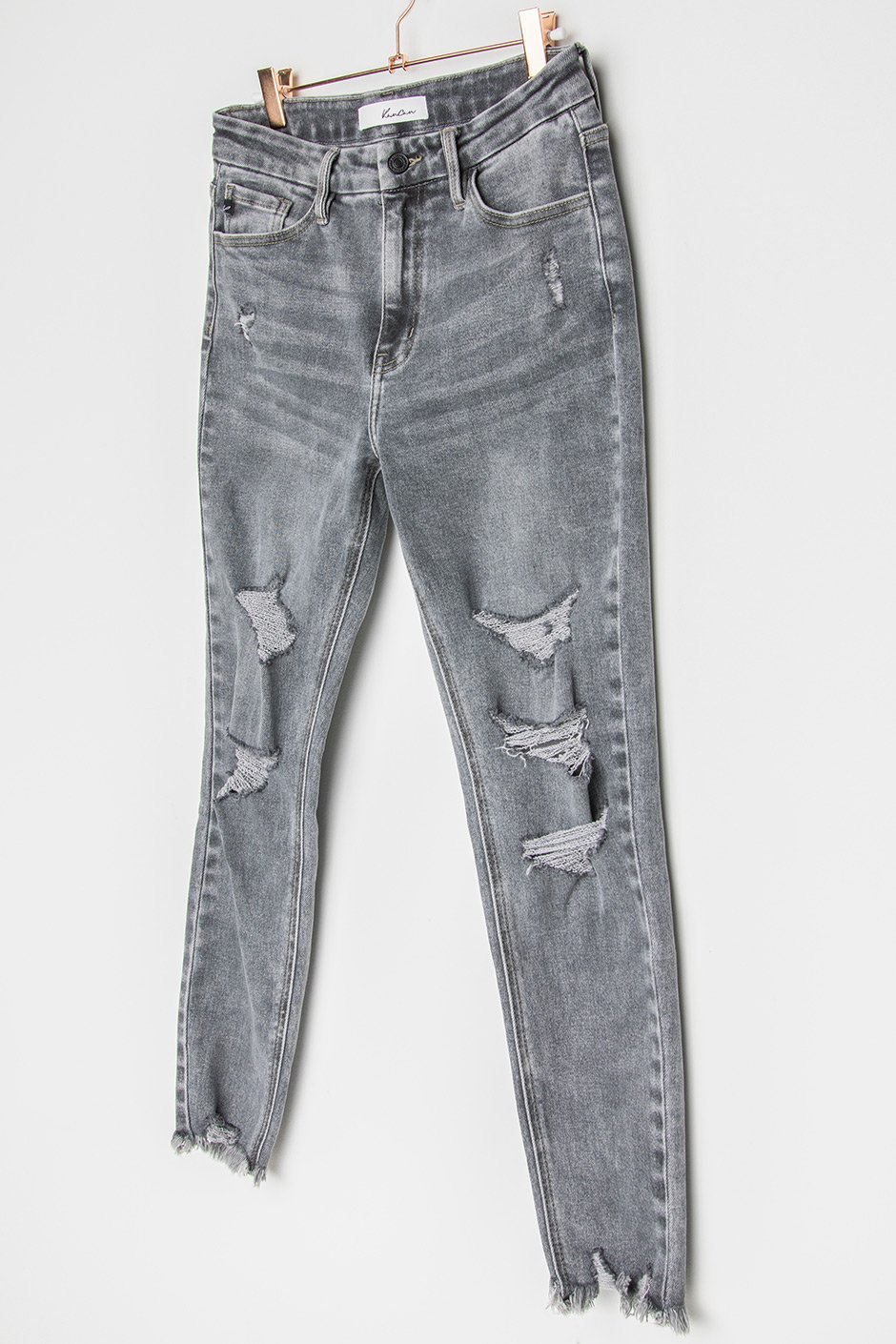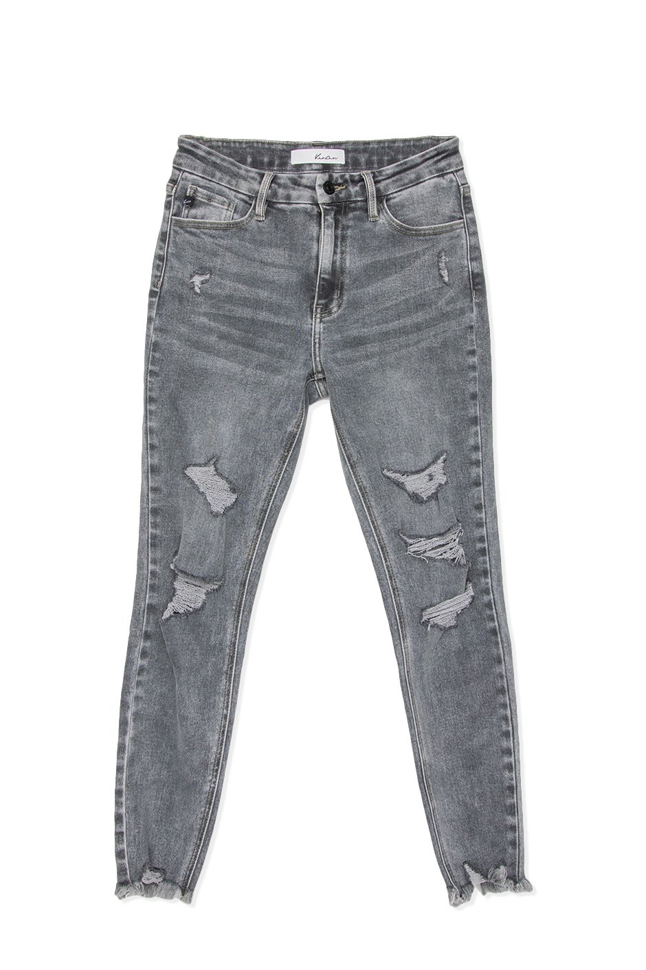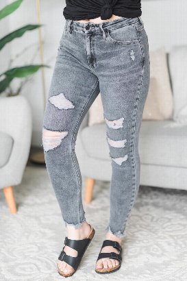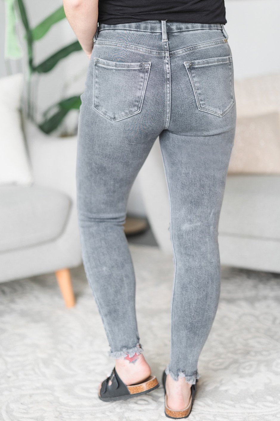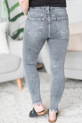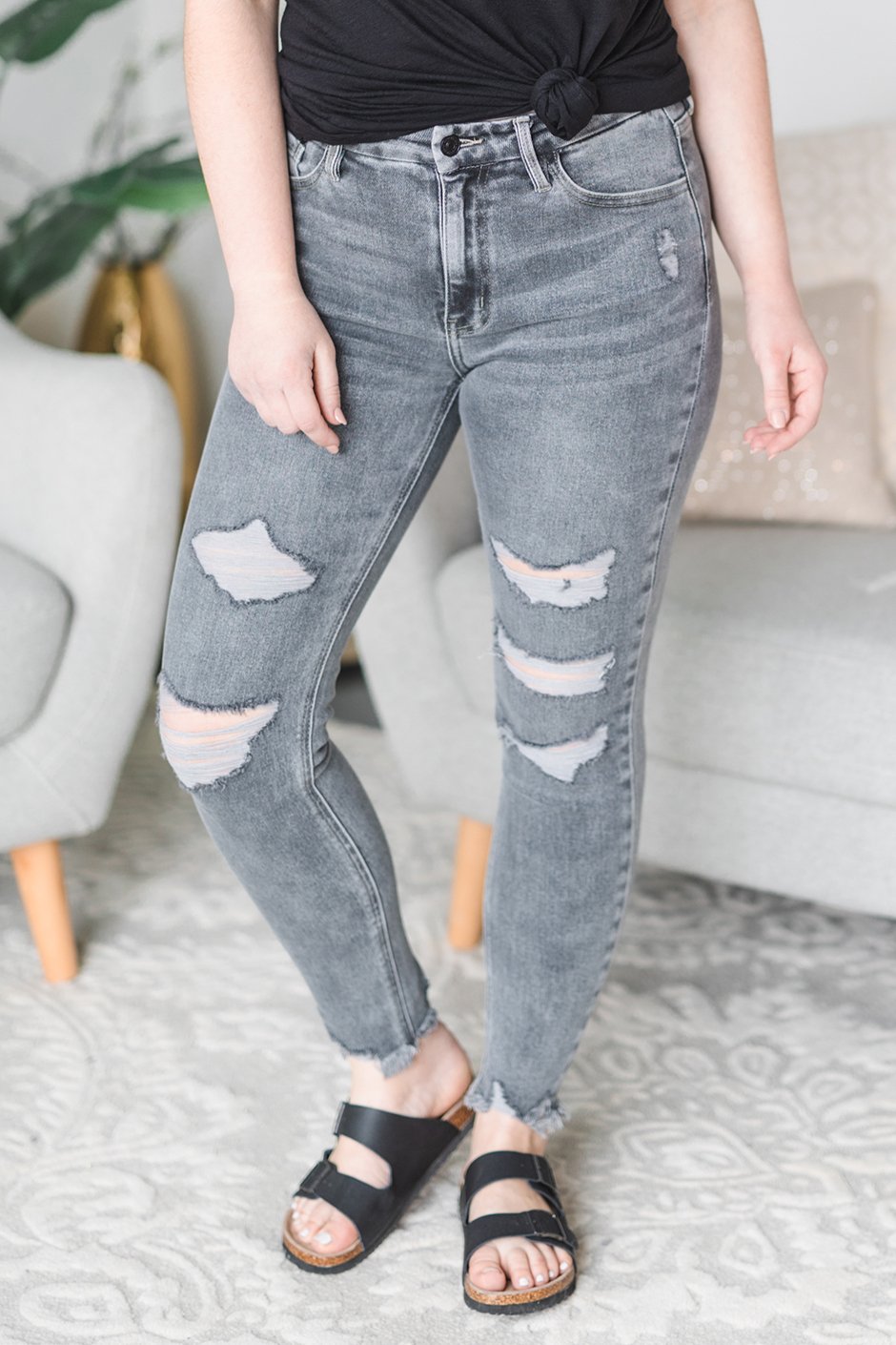 Okay, I literally can't tell you how long I've been waiting for a pair of GOOD stretchy, super comfy and CUTE grey jeans!! They are so stretchy, I can't get over it. I am wearing the size 5 and they're super comfortable. I love the frayed ankle and minor distressing. They are mid to high rise on me. I love them!