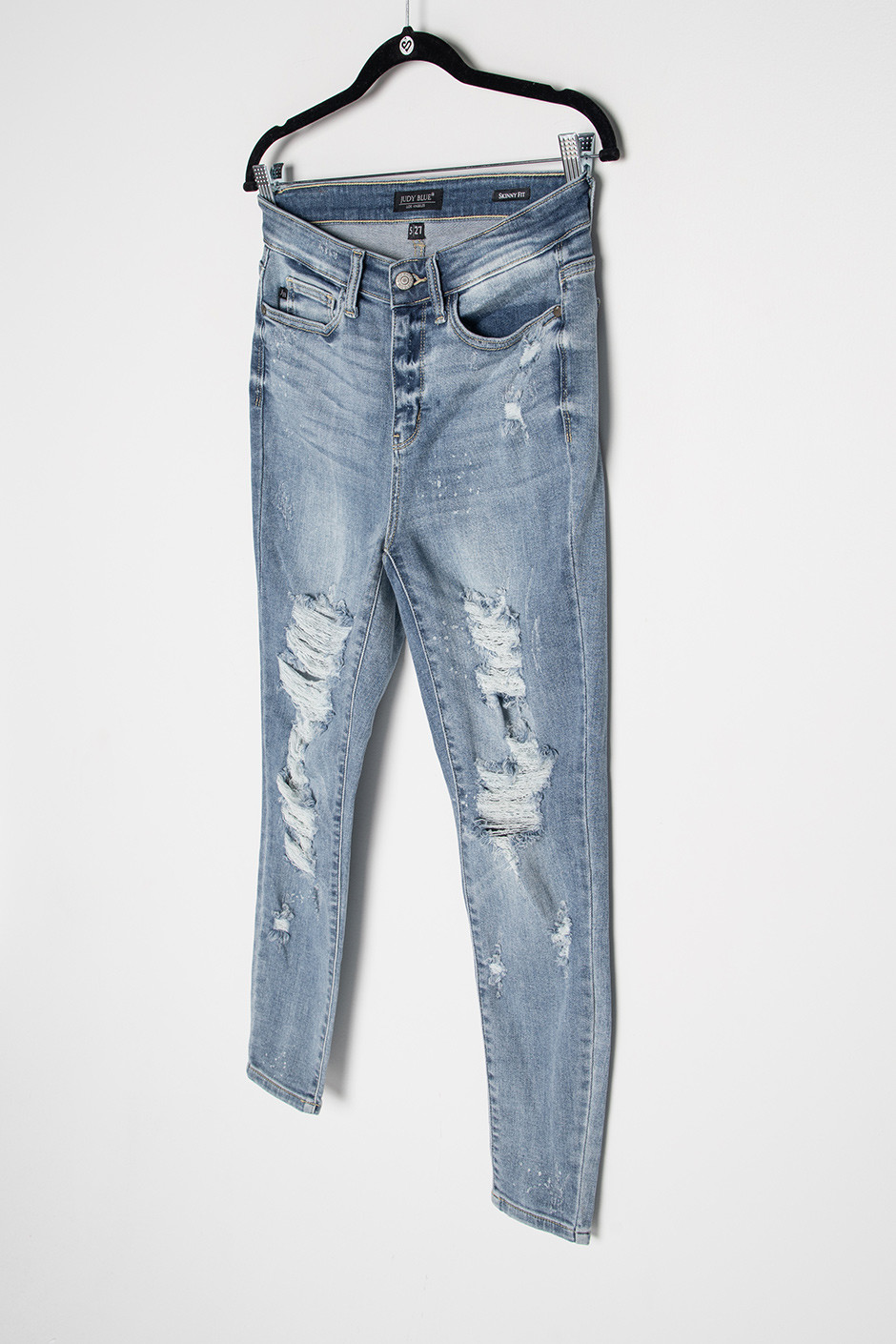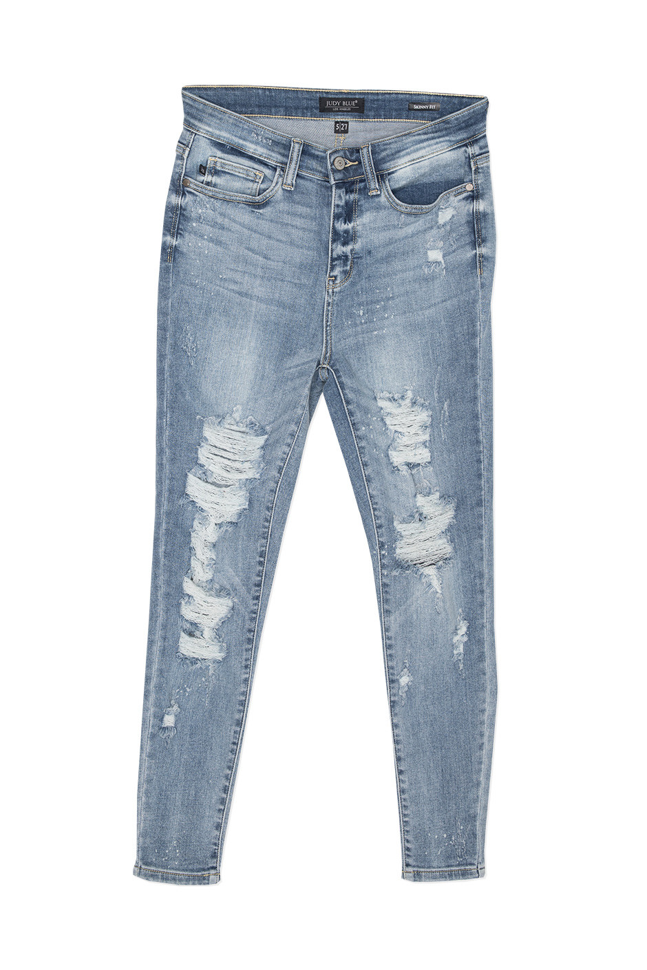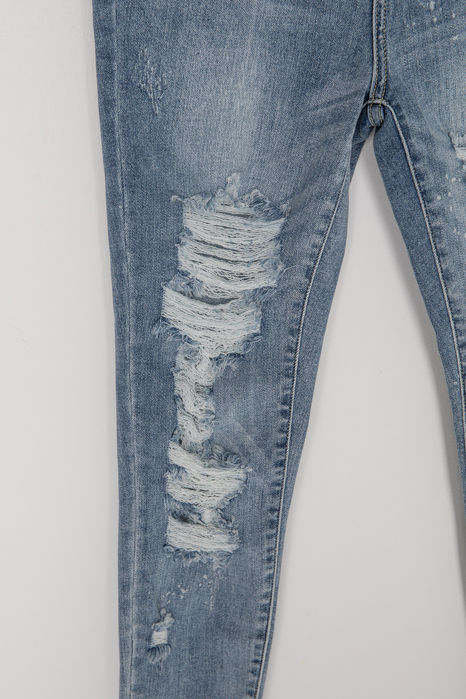 Stretchy, soft, and perfectly destroyed, what more could you want in a pair of jeans! These are a classic skinny fit, in a gorgeous light blue colour. They feature rips as well as a bit of bleach splatter giving them a unique, lived-in look!