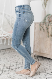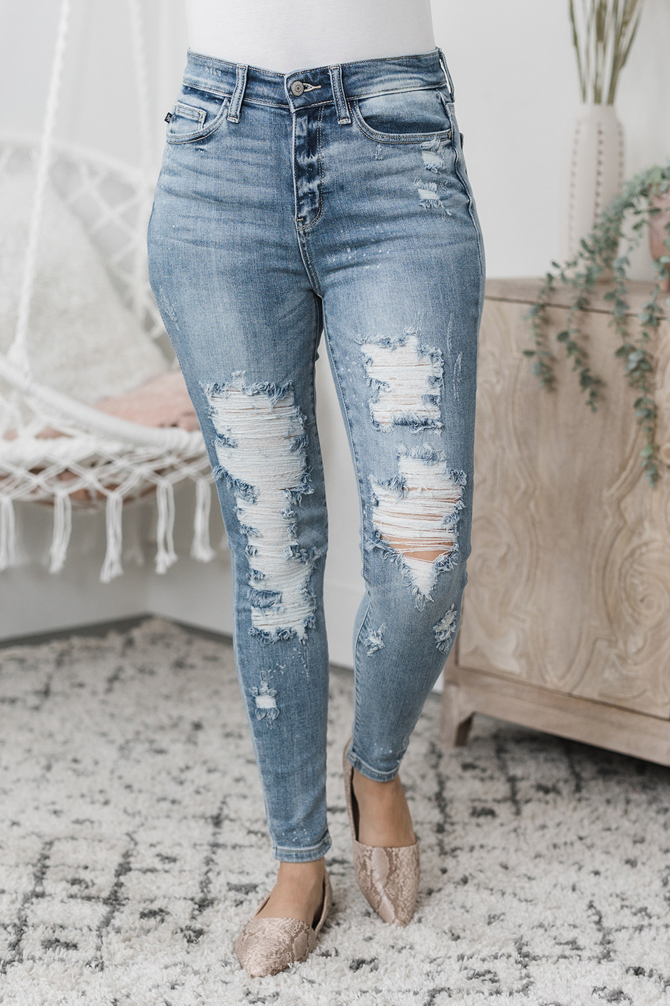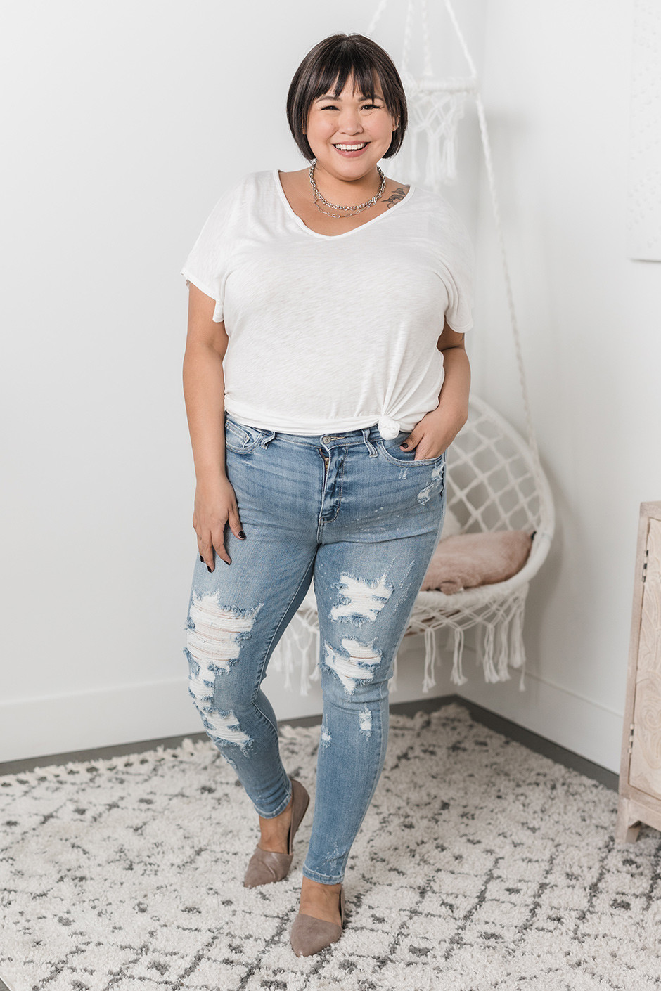 These may be my new favourite distressed denim! The wash, rise, and amount of distressing are just perfection! If you love Judy Blue, I can tell you now, you will love these jeans! They have some stretch, but still have a denim feel to them! I am wearing a size 13 and it's a perfect fit!