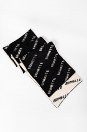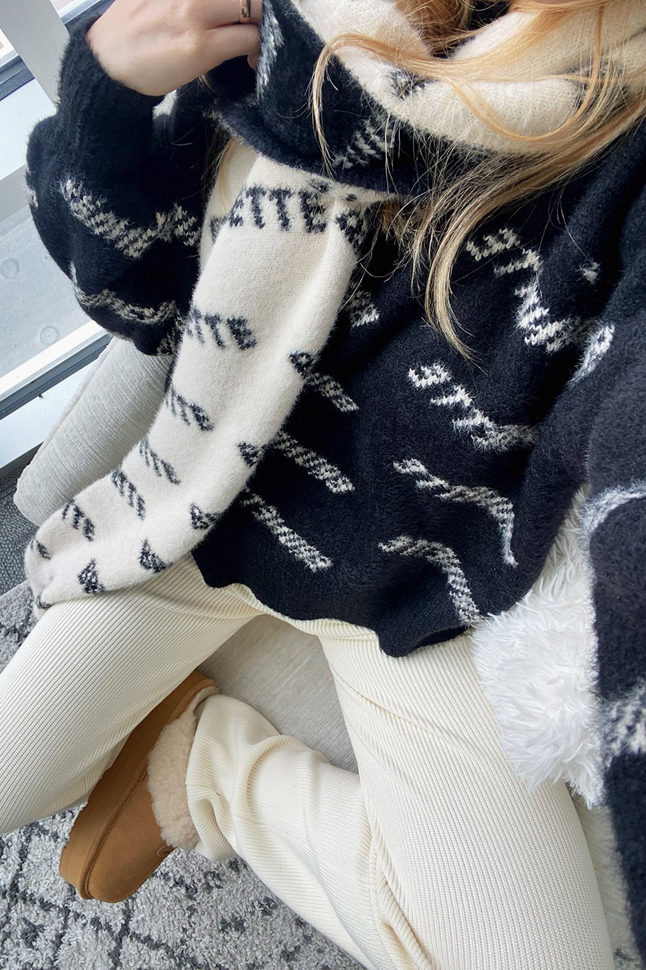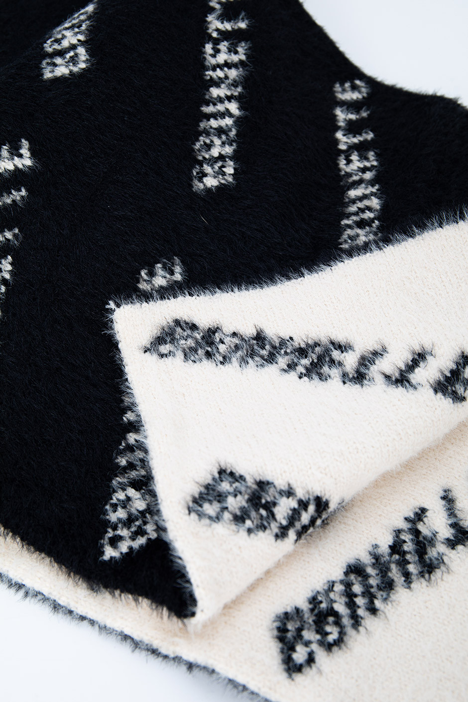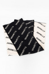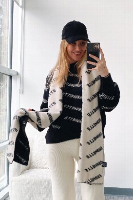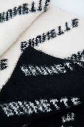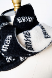Welcome your new favourite scarf... this thing is exceptional, seriously! It's this incredibly thick, almost spongey fleecey knit that is beyond soft and cozy. If this came in a blanket, I would buy 6. It's not itchy, it doesn't shed, all-around exceptional quality! I love the two tone black and white as well. It's unique and so clean and classy looking! The scarf says "BRUNETTE" all over it and just comes in this print. Think of it as a branded logo, not a hair colour ;)