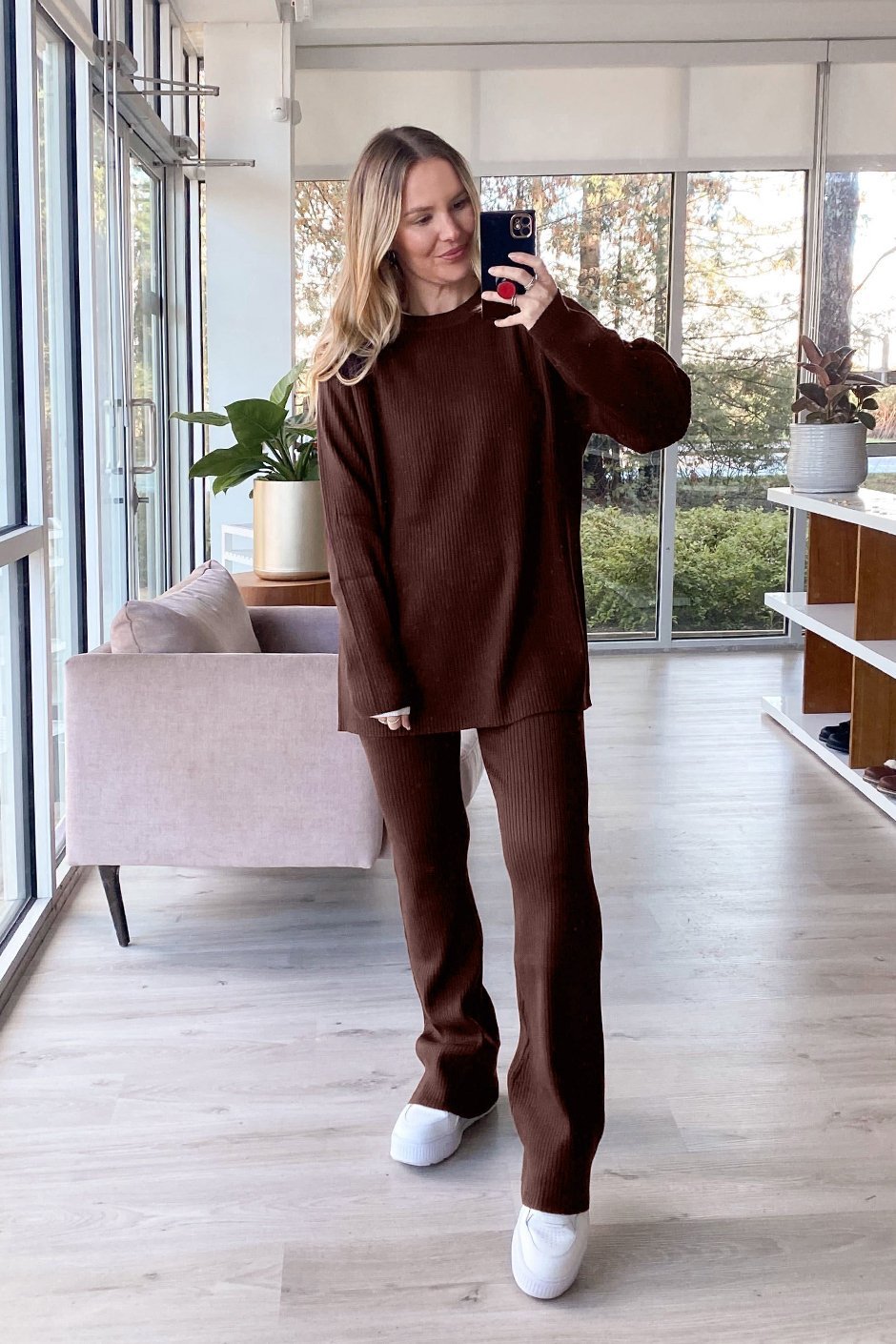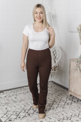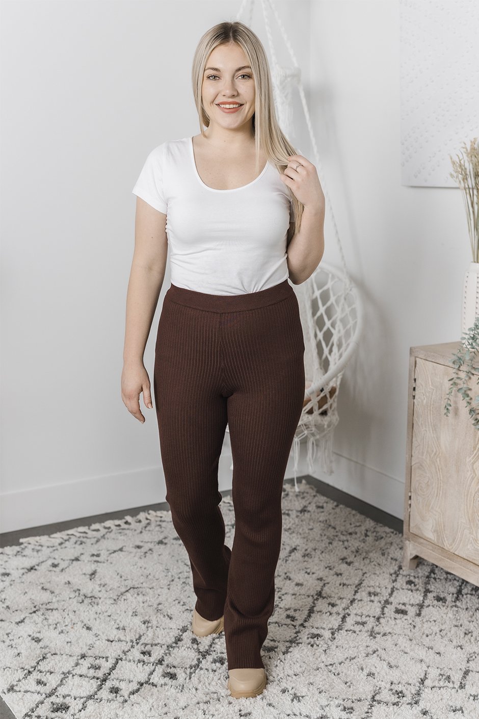 Hold on - these ribbed knit pants are everything!! They are nice and high-waisted and so cute! I will always love a set, and these are perfect pairing for with the crewneck and cardigan! There is an elastic waistband and the material is nice and stretchy, super comfortable to wear! I am wearing a L/XL and it's a perfect fit!