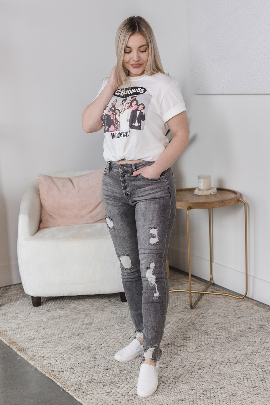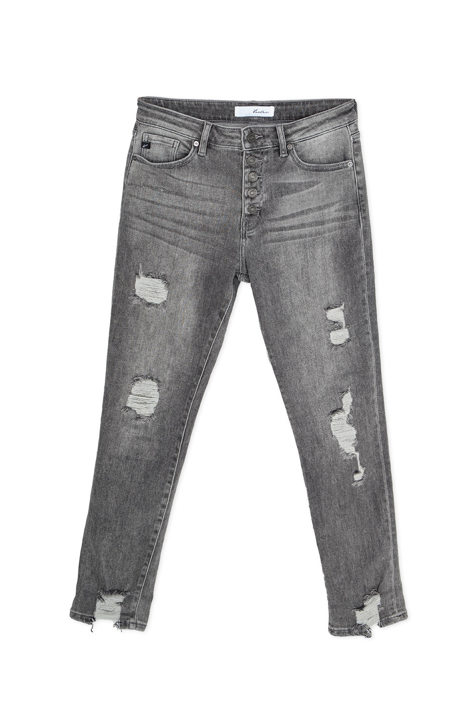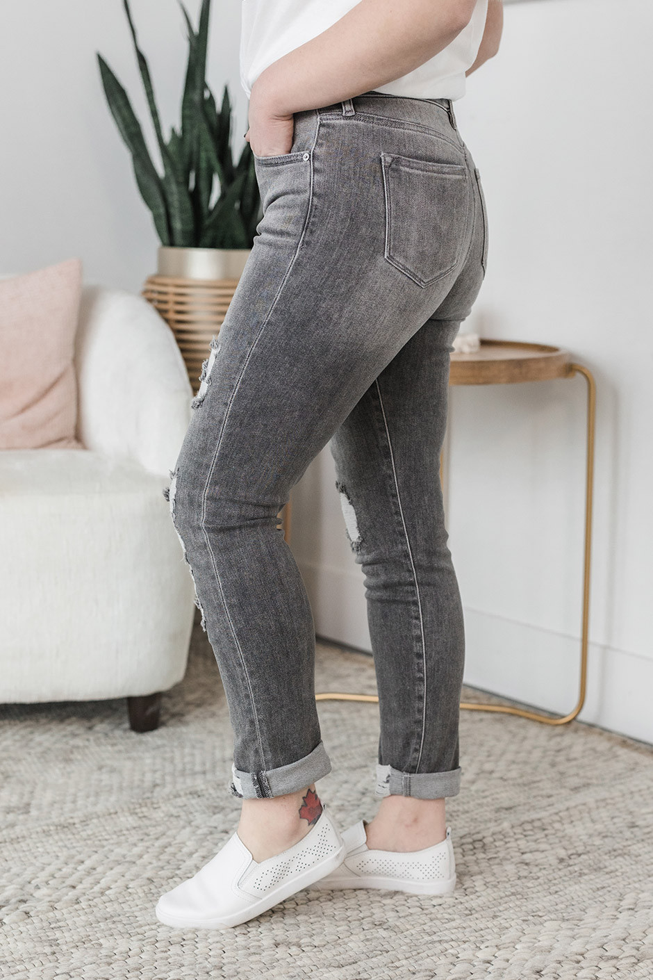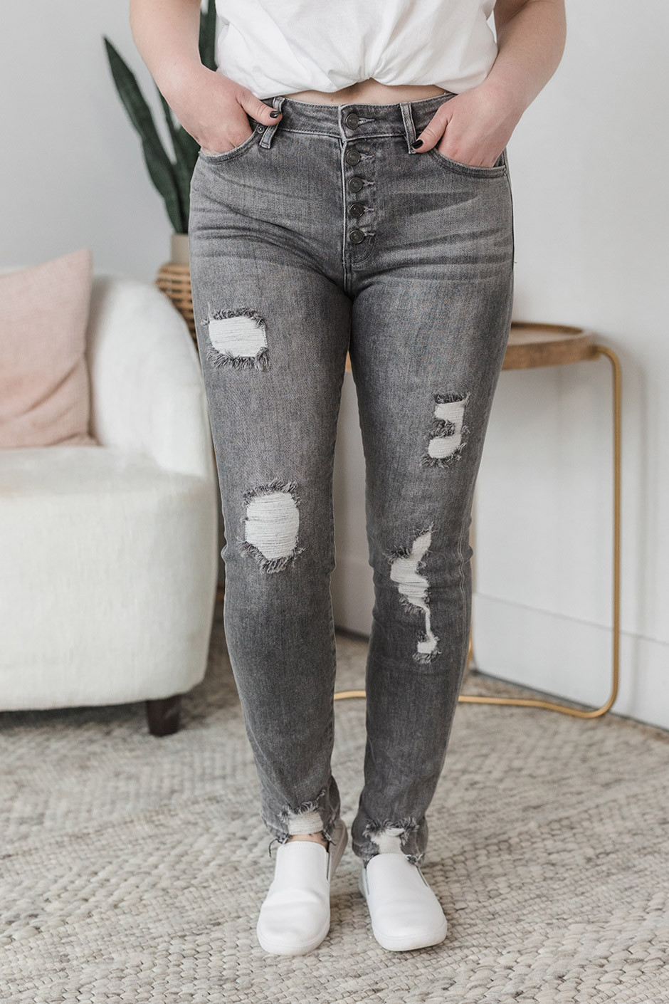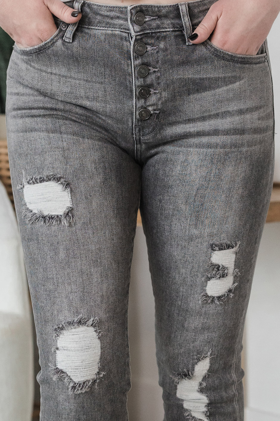 I love a good pair of grey denim! They are the start of many good fresh outfits, I can't wait to get these in my closet! They are KanCan so I sized up to a 7 as this is my preferred size in this brand which is 1 size up from my Judy Blue size! They are a mid to higher rise with stretch and some distressing.