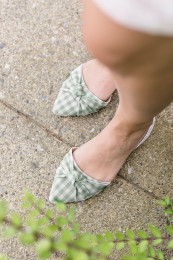 These little slingbacks are so fun and sweet! I love the gingham pattern and the knotted detail is just the cherry on top! They are quite comfortable and perfect for dressing up but would look great with denim capri for a more casual look! I always find that a pointed-toe shoe is always so flattering. I am wearing a size 8 and it's a bit too big, so I know a 7.5 would be a perfect fit!