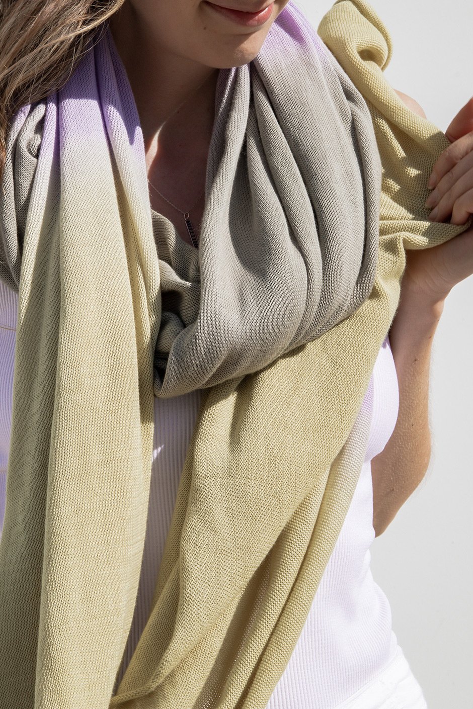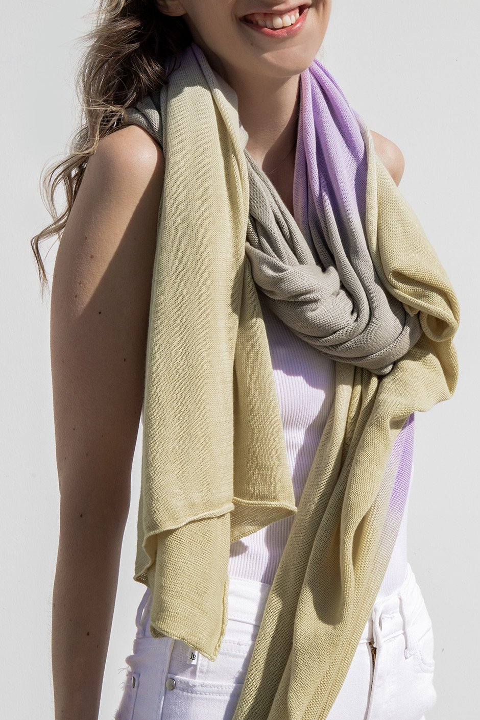 This lightweight scarf is a breath of fresh air! The subtle colours blend beautifully like a watercolour painting. If you are in the market for a dreamy soft accessory, this is it! Feel free to pair it with your favourite dress or a simple tee!