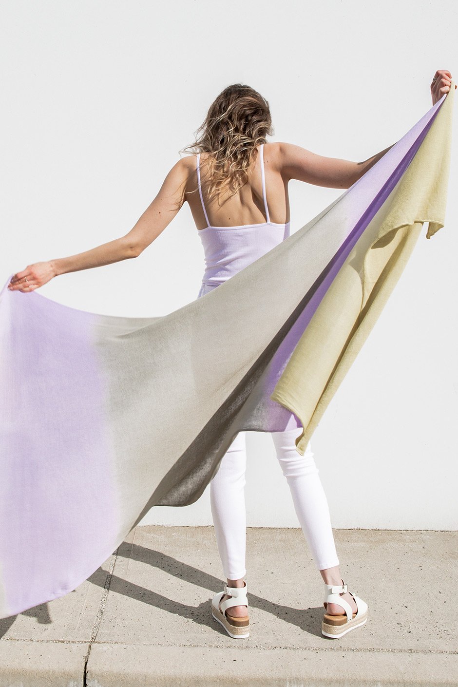 This scarf is so perfect for cool summer nights or a breezy day at the beach! It’s super lightweight and flowy, and the purple and green combo is so bright and fun! So easy to throw on with denim shorts and a simple tank to add a pop of colour!