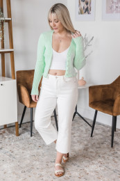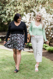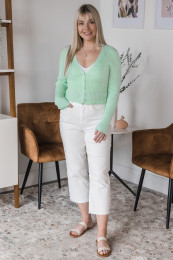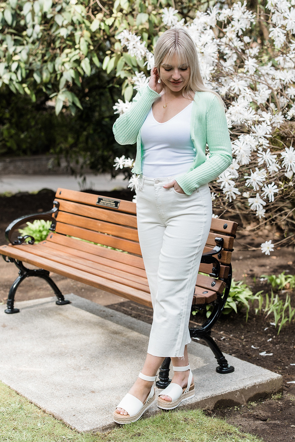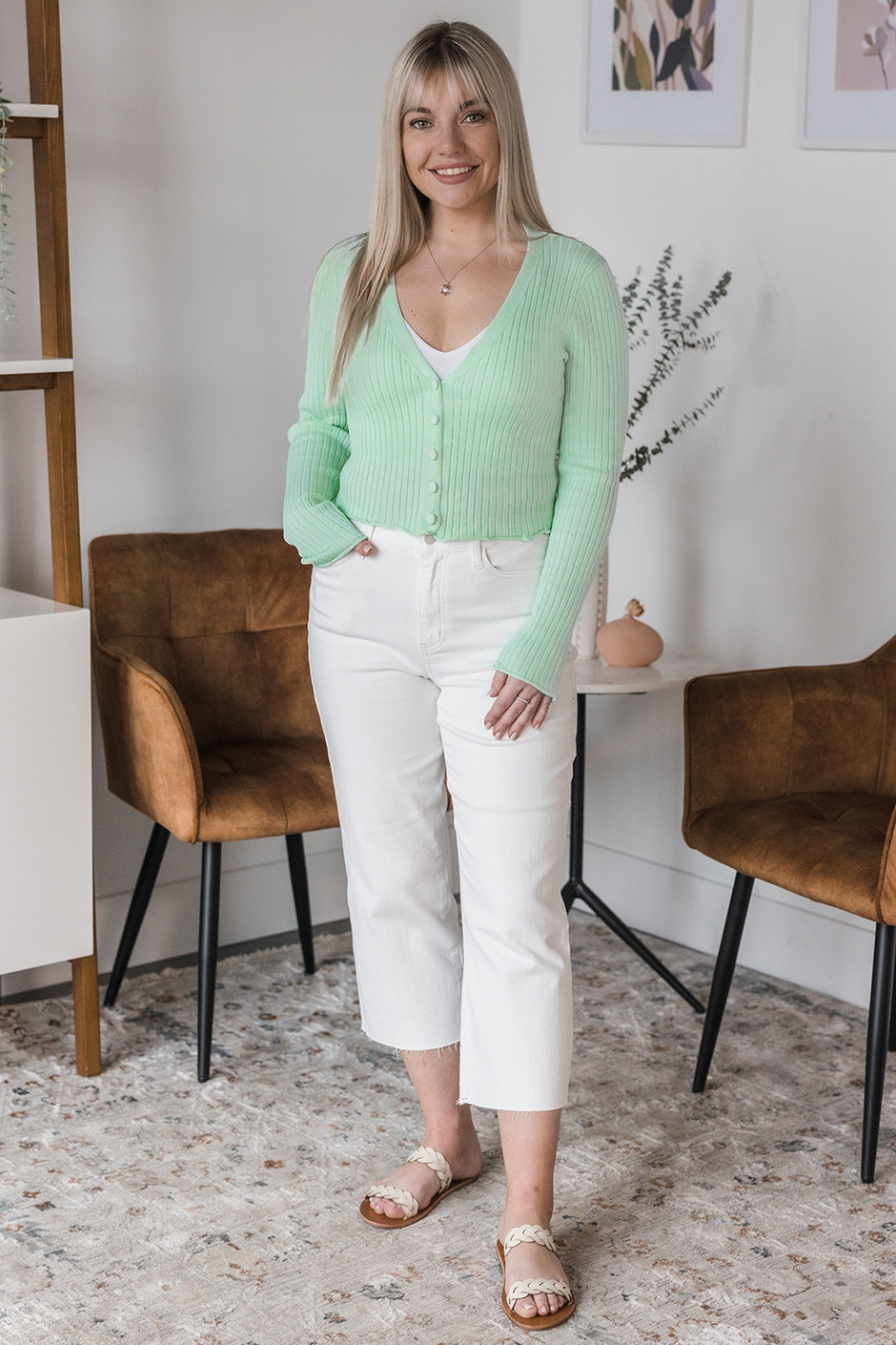 I am obsessed with this cute little cardi! I love the lettuce-edge trim, so 90's! This can be worn open or done up but I will say that the buttons are fabric covered and a little tricky to un-do. It's not super lightweight so this is great to wear over a summer dress if you're chilly or through spring and the end of summer. It's a slightly heavier weight and super stretchy because it's ribbed! I am in the size small but could go up to medium if I wanted the sleeves a little looser. I would say it's a similar fit to our Snap to It's & Snap Happy Cardigans!
