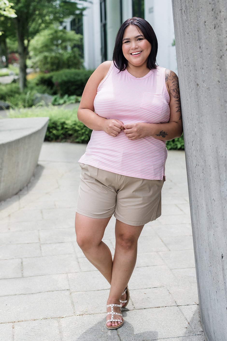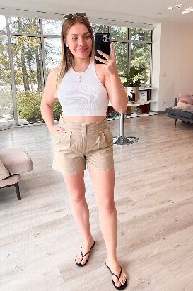 Talk about UNDERRATED!!! These are legit the comfiest shorts I have ever worn! Great for work as they are a more conservative length but holy moly, all over stretch with a stretchy paper bag waist. They are a higher rise, covering my belly button. I am wearing my true size S here and they fit like a dream! Not too tight anywhere! 👌