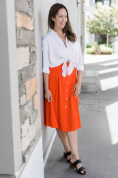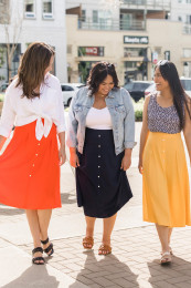My favourite length is a midi! The best feature (other than the gorgeous colours) is the faux buttons down the front. Such a cute extra detail. I found the waistband to be stretchy and comfy too. The skirt itself is not stretchy. I’m wearing the size medium, and it fit great!