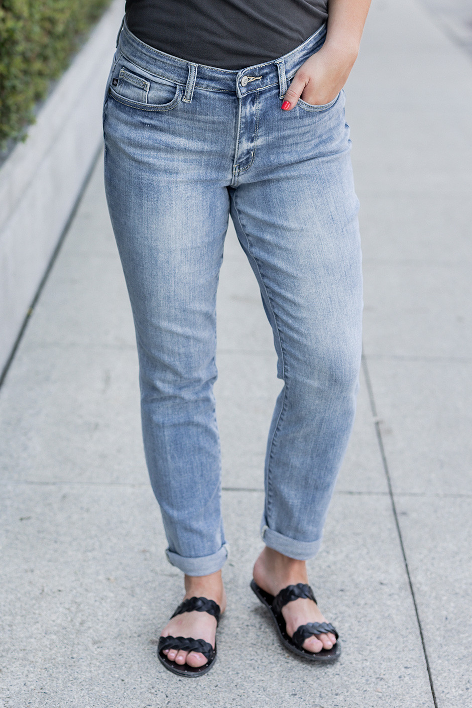 Can we just have a moment to appreciate all that is Judy Blue! These are such perfect light-wash jeans! They aren't distressed and have a relaxed boyfriend fit that I love so much! They are a bit long on me, but I am a gal that is used to needing to cuff her denim! Jeans like this are always needed as they can be worn so often! I am wearing a size 13 and it's my perfect fit!