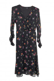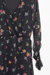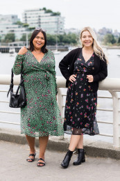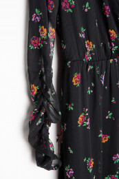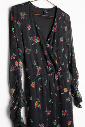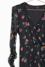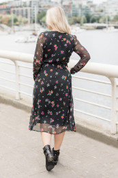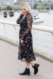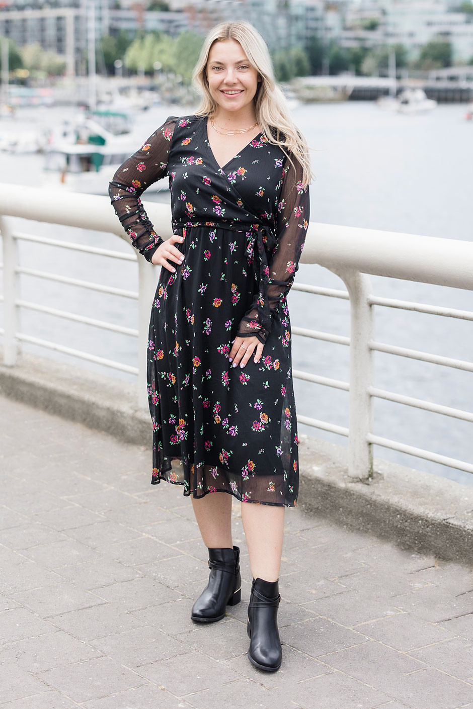 Oh this dress is absolutely gorgeous and very comfortable! I love the length, perfect with a little bootie. The sheer, ruched sleeves are so pretty, probably my favourite part about this dress. They’re not stretchy but fit great. Not too tight. The underlayer is soft and comfortable. I love that you can style the tie however you’d like or remove it! I am wearing the size small and found it to fit perfectly. It’s flowy in the body and fits perfectly in the chest and sleeves.