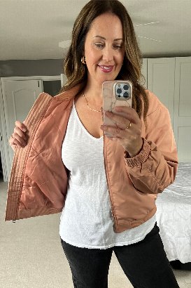 The quality of this jacket is outstanding! It's a medium-weight material with a quilted almost light-puffy feel to it. Perfect for wearing through the end of winter and into spring! This jacket features pockets with snap closures, full zip and a super cute ribbed & stretchy bottom hem and collar. it's fully lined making it very comfy to wear with a tee underneath. My favourite detail is the gathering on the back of the sleeves! I find this piece true to size with a touch of room, although this is the intended fit. I am wearing the size small and had room for the light hoodie underneath!