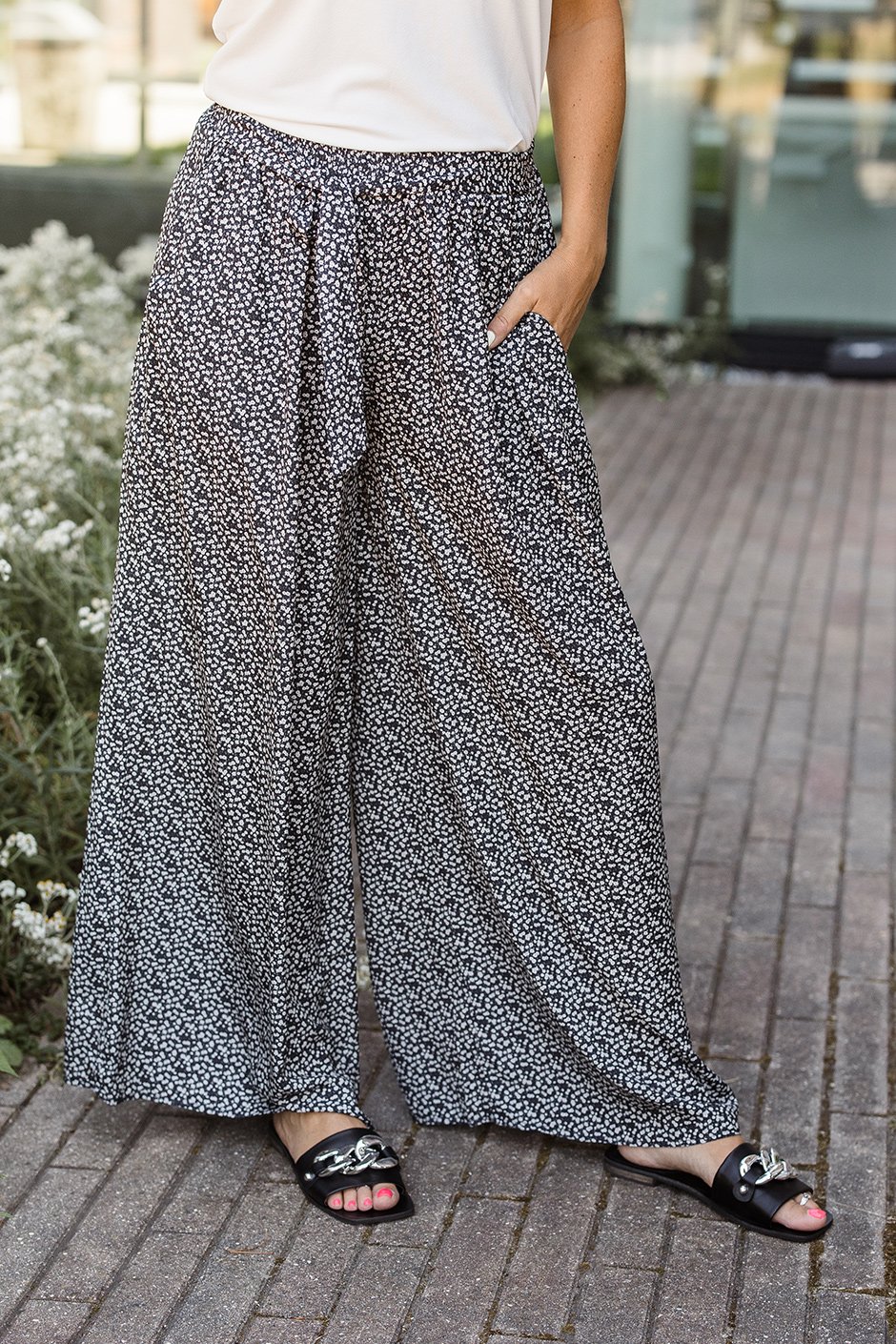 These pants are a flattering wide-leg style, and feature an attached tie at the waist, an elastic waistband, and everyone's favourite - pockets! They have a cute small floral print and are super lightweight and flowy, making them perfect for the warm summer months.