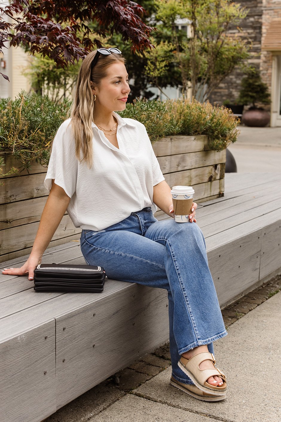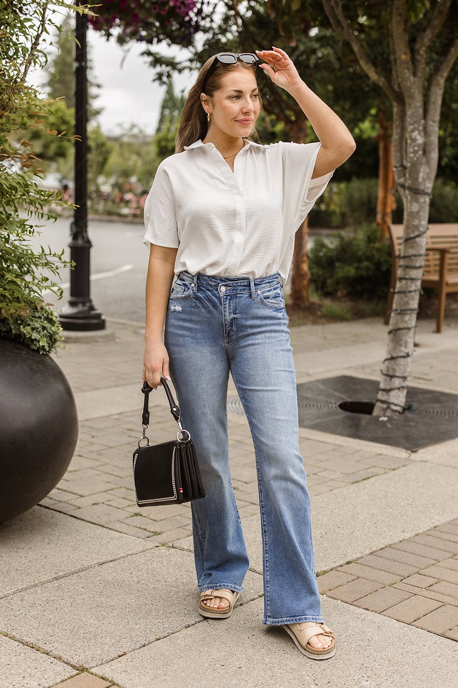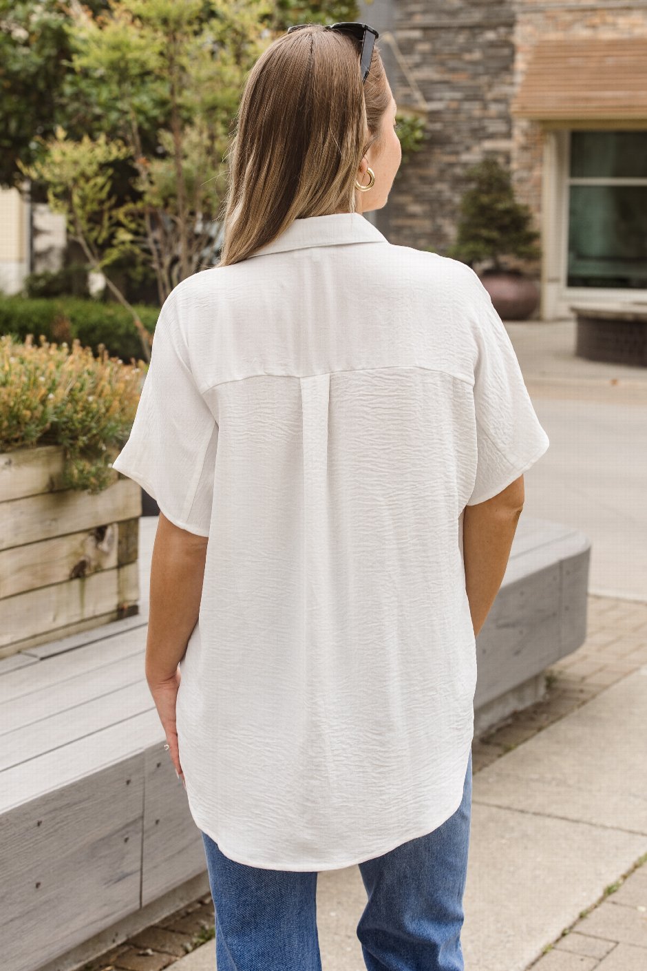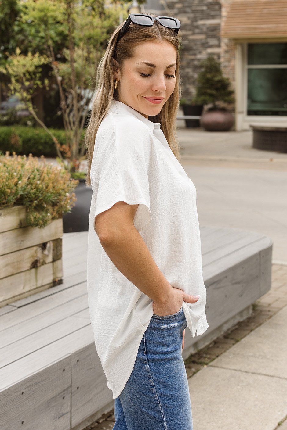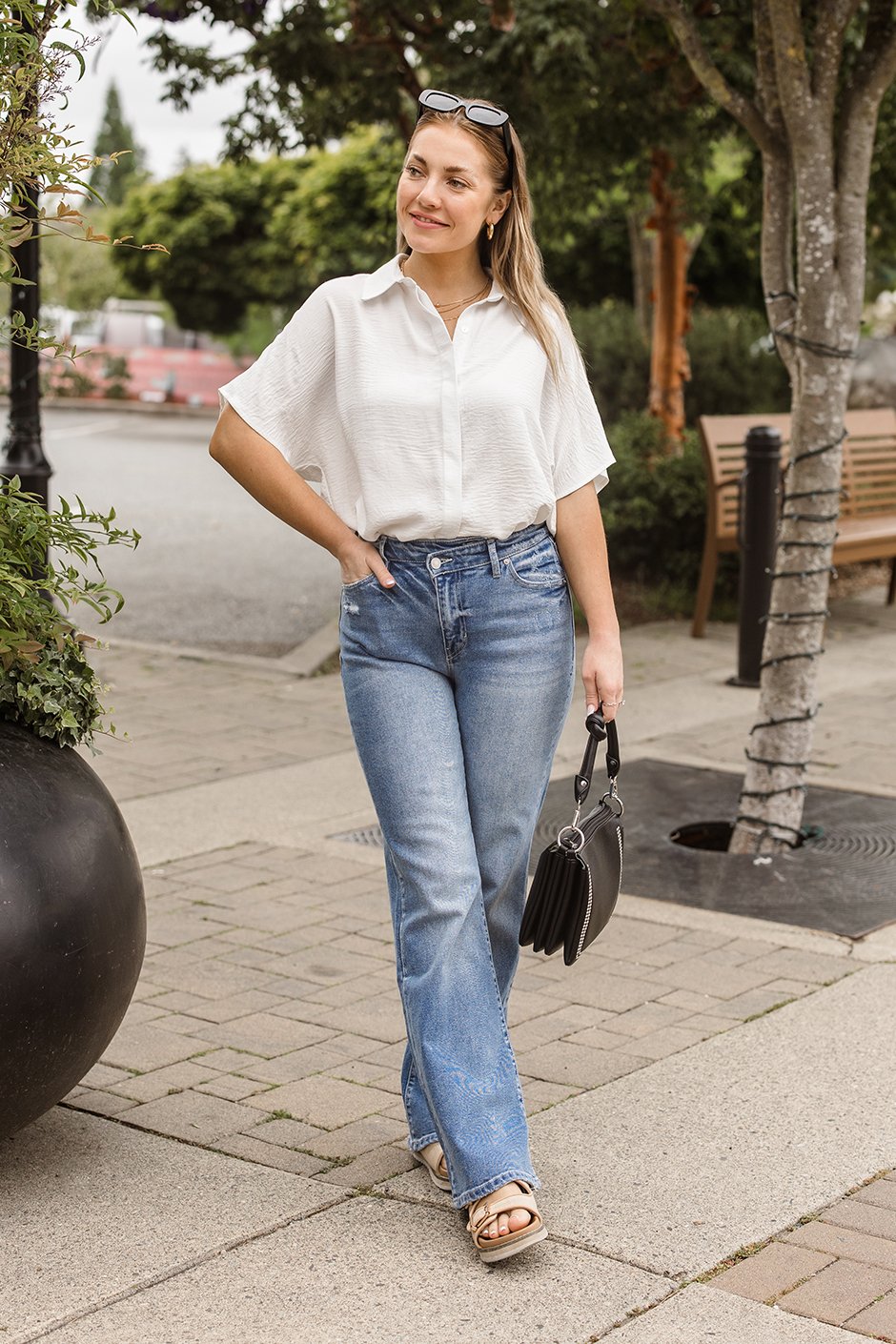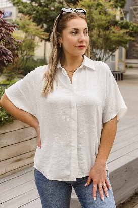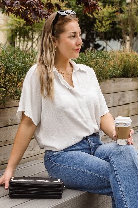 Oh my! I absolutely adore this type of shirt! The colour is stunning. The fit is just so nice offering a flattering silhouette, and the material is just gorgeous, similar to the Off To Brunch Top. It offers a bit of give. I’m wearing the size XL. I found it to be a bit too big so for that reason I would size down. You guys are going to love this one.